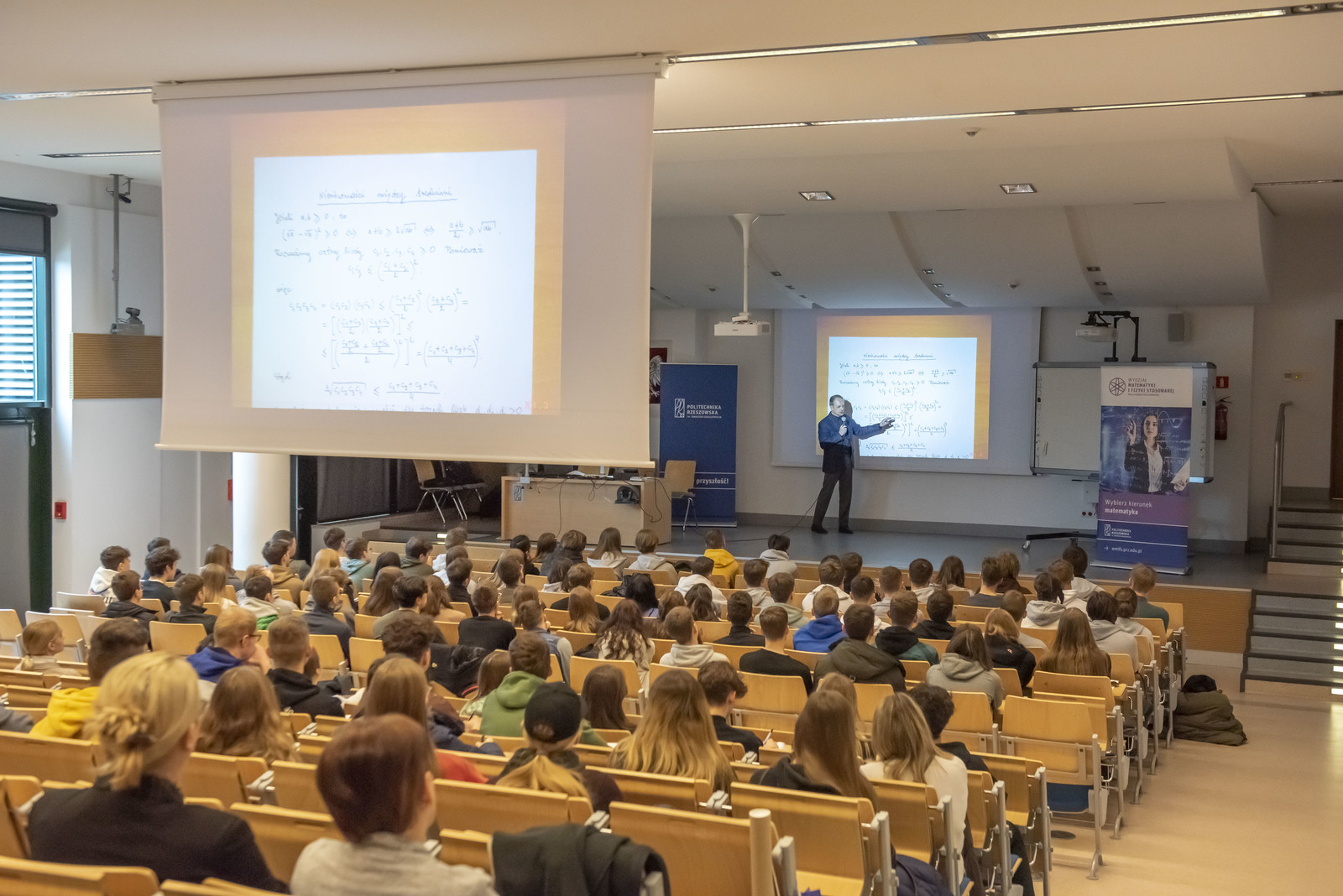 Podczas obu dni zgromadzoną młodzież uroczyście powitali rektor Politechniki Rzeszowskiej prof. dr hab. inż. Piotr Koszelnik oraz prorektor ds. kształcenia dr hab. Iwona Włoch, prof. PRz. Władze dziekańskie WMiFS w krótkiej prezentacji przedstawiły kierunki studiów prowadzone na wydziale oraz perspektywy zatrudnienia absolwentów. Inauguracje Dni Otwartych uświetniły występem artystycznym studentki kierunku matematyka Katarzyna Biela i Klaudia Bukała. Młodzież miała okazję uczestniczenia w wykładach i warsztatach, które zostały podzielone na trzy główne panele związane z kierunkami studiów: inżynierią i analizą danych, inżynierią w medycynie oraz matematyką. Panele zostały uzupełnione o pokazy z fizyki, a także o zwiedzanie wydziałowych laboratoriów oraz biblioteki. Wykłady, warsztaty i pokazy prowadzili nauczyciele akademiccy prowadzący zajęcia na wymienionych kierunkach, lekarze oraz pracownicy zaprzyjaźnionych dwóch firm medycznych ImplantCast i STRING, jak również studenci kół naukowych: Machine Learning, X-med oraz Foton. Podczas Dni Otwartych aktywny udział wzięli studenci z Wydziałowego Samorządu Studenckiego oraz studenci WMiFS, którzy chętnie opowiadali uczniom o studiach w trakcie zwiedzania wydziału.