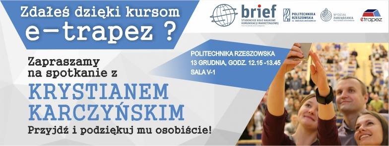 Spotkanie z internetowym nauczycielem matematyki na Politechnice Rzeszowskiej organizuje Studenckie Koło Naukowe Komunikacji Marketingowej BRIEF. „Większości studentów naszej uczelni nie trzeba przedstawiać, twórca najpopularniejszego serwisu e-learnigowego z matematyki, osoba, która najtrudniejsze zadania matematyczne potrafi zamienić na banalnie proste, zagości na Politechnice Rzeszowskiej już 13 grudnia!” – napisali na facebookowej stronie wydarzenia.
