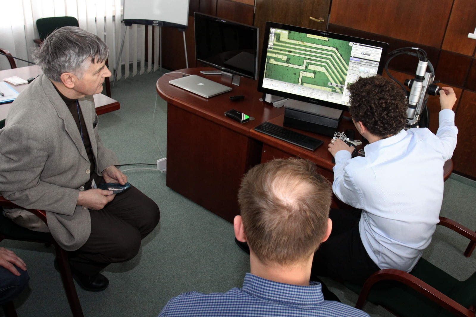 Spotkanie otworzył dr hab. inż. Jerzy Potencki, prof. PRz z Katedry Systemów Elektronicznych i Telekomunikacyjnych, zachęcając zebranych do wysłuchania i zapoznania się z możliwościami wielofunkcyjnego i najnowocześniejszego mikroskopu RH- 2000 3D Hirox. Prezentację poprowadzili Katarzyna Piekarska i Emilien Leonhardt z Hirox. Przybliżyli historię firmy oraz przedstawili zalety urządzenia: inspekcję na żywo zapisu filmów, tworzenie obrazu panoramicznego, kontrolę jakości, badanie powierzchni, dużą rozdzielczość. Mikroskop dokonuje m.in. pomiarów 2 i 3D oraz profilowania 3D, pomiaru powierzchni i objętości, łączenia obrazów 3D.