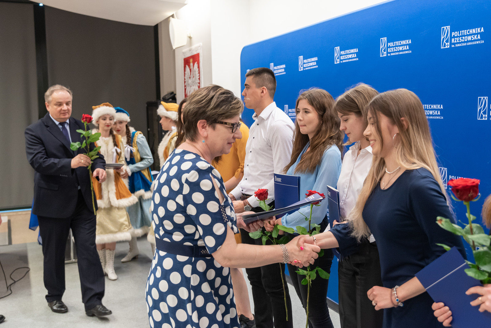 Uroczystość rozpoczęła się miłym artystycznym akcentem, jakim był występem wokalny dwóch wyróżnionych studentek z Wydziału Matematyki i Fizyki Stosowanej – Katarzyny Bieli i Klaudii Bukały. Następnie prorektor ds. kształcenia dr hab. Iwona Włoch, prof. PRz i prorektor ds. studenckich prof. dr hab. Grzegorz Ostasz wręczyli nagrody i lity gratulacyjne studentom. „Razem z panią prof. Iwoną Włoch mamy ogromną satysfakcję, wręczając w imieniu JM Rektora nagrody tak licznej grupie studentów naszej Politechniki. Wyróżnieni zostali nie tylko przedstawiciele wszystkich wydziałów, ale też liderzy Samorządu Studenckiego oraz grupa sportowców reprezentująca Akademicki Związek Sportowy. Wszyscy Państwo świetnie pokazaliście, że można łączyć obowiązki studenta z prawdziwą pasją na różnych płaszczyznach. Serdecznie wszystkim gratulujemy" - powiedział prof. G. Ostasz.